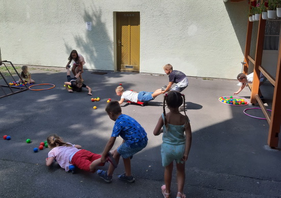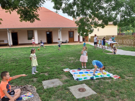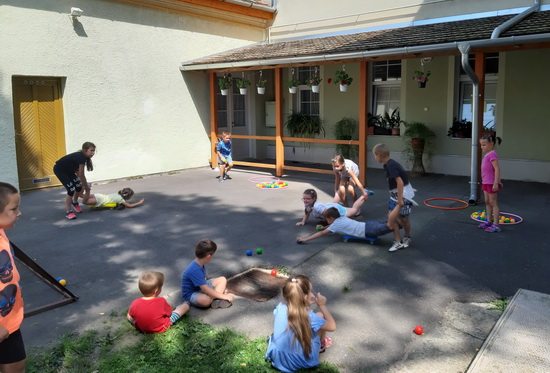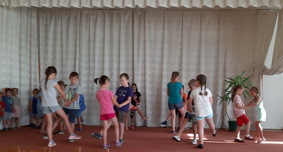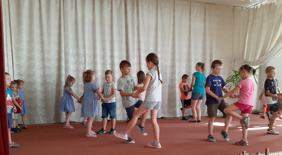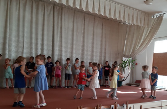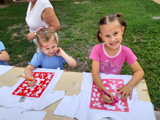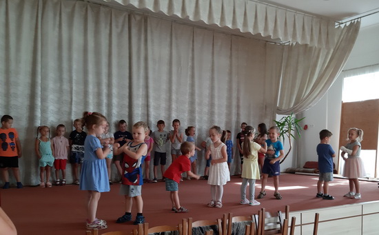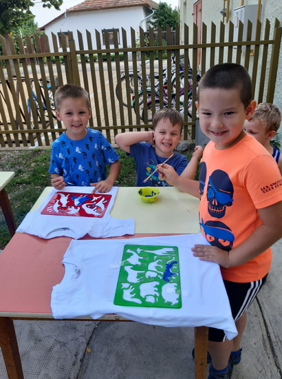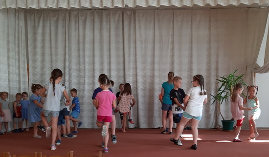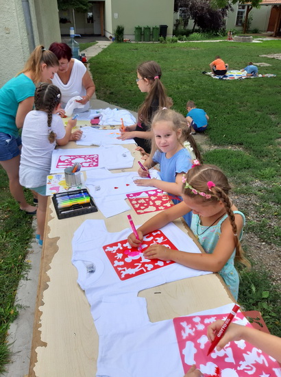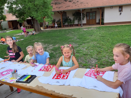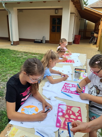 A táborunk harmadik napja is a tánc jegyében telt el. Az eddig tanult táncok ismétlése mellett a nagyobbak megtanultak egy új táncot is. A pihenőidőbe belefért még egy kis kézműveskedés, póló dekorálás és ügyességi játék is.