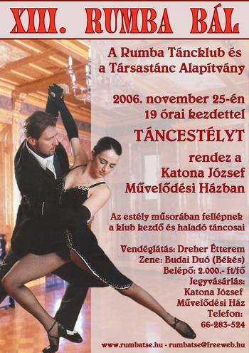 A Rumba Táncsport Egyesület és a klubot tizennégy éve támogató alapítvány idén ismét megrendezi a hagyományos jótékonysági estélyét XIII. Rumba Bál néven. Minden érdeklődőt szeretettel várunk.