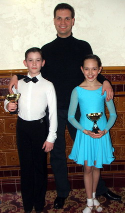 A blackpooli döntős gyermek páros, Deák András és Andor Barbara edzőjükkel, Megyeri Csabival.