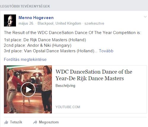 A klubunk szimpatizánsai, Facebook kedvelői tábora segítségével igen szép eredményt ért el Andor és Niki a a WDC Samba koreográfiai versenyén (WDC DanceSation Dance of the Year). Népszerű lett a táncuk és ezért nagyon sokan nyomtak a YouTube-on majd Facebook-on like-ot. A lájkoknak köszönhetően Andor és Niki, Megyeri Csabi koreográfiájával a második helyezést érte el és pénzjutalomban részesültek. Köszönjük a segítséget és gratulálunk a fiataloknak!