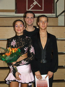 Molnár Ádám és Paróczai Rebeka az eredményhirdetés után Megyeri Csaba táncos edz?jük társaságában.